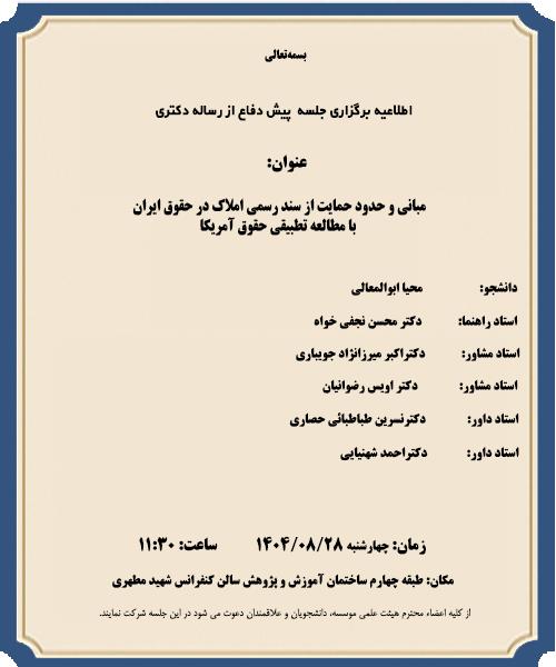 اطلاعیه پیشدفاع خانم محیا ابوالمعالی - دانشجوی دکتری حقوقخصوصی