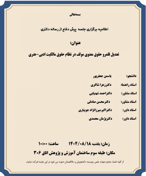 اطلاعیه پیش دفاع خانم یاسمن جعفرپور - دانشجوی دکتری حقوق خصوصی